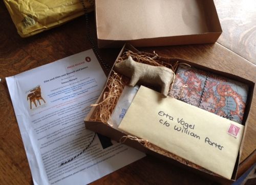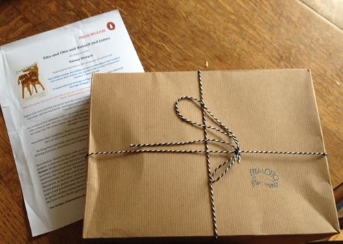 No matter how big my tower of must-read titles, I am always excited to find another book delivered in the post. And today I was doubly delighted when I found that I had been sent a book placed in a cardboard box, tied with coloured string, wrapped in colourful paper, nestling in a bed of straw. With it was a papier-mache pig, letter bearing a Canadian stamp and a maple syrup custard cream biscuit.