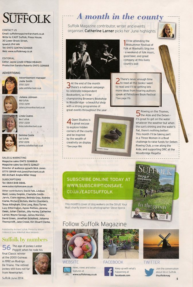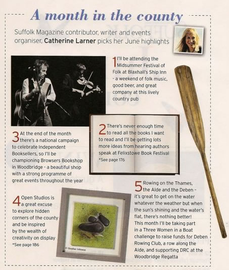 I seem to have taken over the latest issue of 'Suffolk Magazine' - my articles about Griff Rhys Jones, Felixstowe Book Festival and thriller writer, Colette McBeth all appear, but my adventure as Three Women in a Boat is also reported, and I was asked to present my highlights for the coming month in the introductory page.