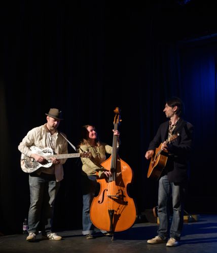 To get us in the mood for Grantchester, I invited local musicians Jenny Wren and Her Borrowed Wings to perform on stage as the audience gathered and at the conclusion of the evening when James was signing books. They sang and played without amplification, giving a jazz and blues feel with their original music. After tonight's performance they have a European tour, but I was introduced to them when they busked outside Browsers Bookshop at Christmas.